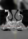 Le cliché 3D pré-opératoire révèle une cloison (ou refend) au sein du sinus maxillaire droit d’une patiente de 67 ans.