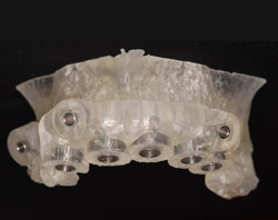 Le premier guide (en bas sur la photo) permet de réséquer la crête en vue de la pose des 5 implants à l’aide du second guide (en haut sur la photo). Les ouvertures supplémentaires permettent de fixer le guide avec les deux vis d’ostéosynthèse (violettes dans la simulation).