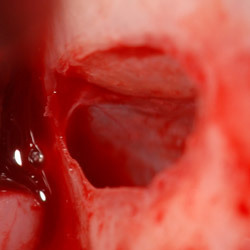 Une poudre d’os est placée pour combler le sinus maxillaire et permettre la pose d’implants.