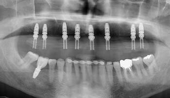 Les 8 implants sont posés et l’armature du bridge provisoire est visible sur le cliché panoramique.