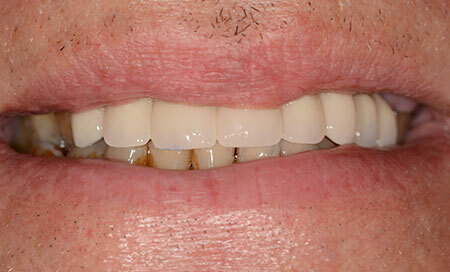 Le bridge fixe provisoire sur 4 implants est remis au patient 5 jours après la chirurgie d’extraction-implantation immédiate complétée par des régénérations osseuses guidées.